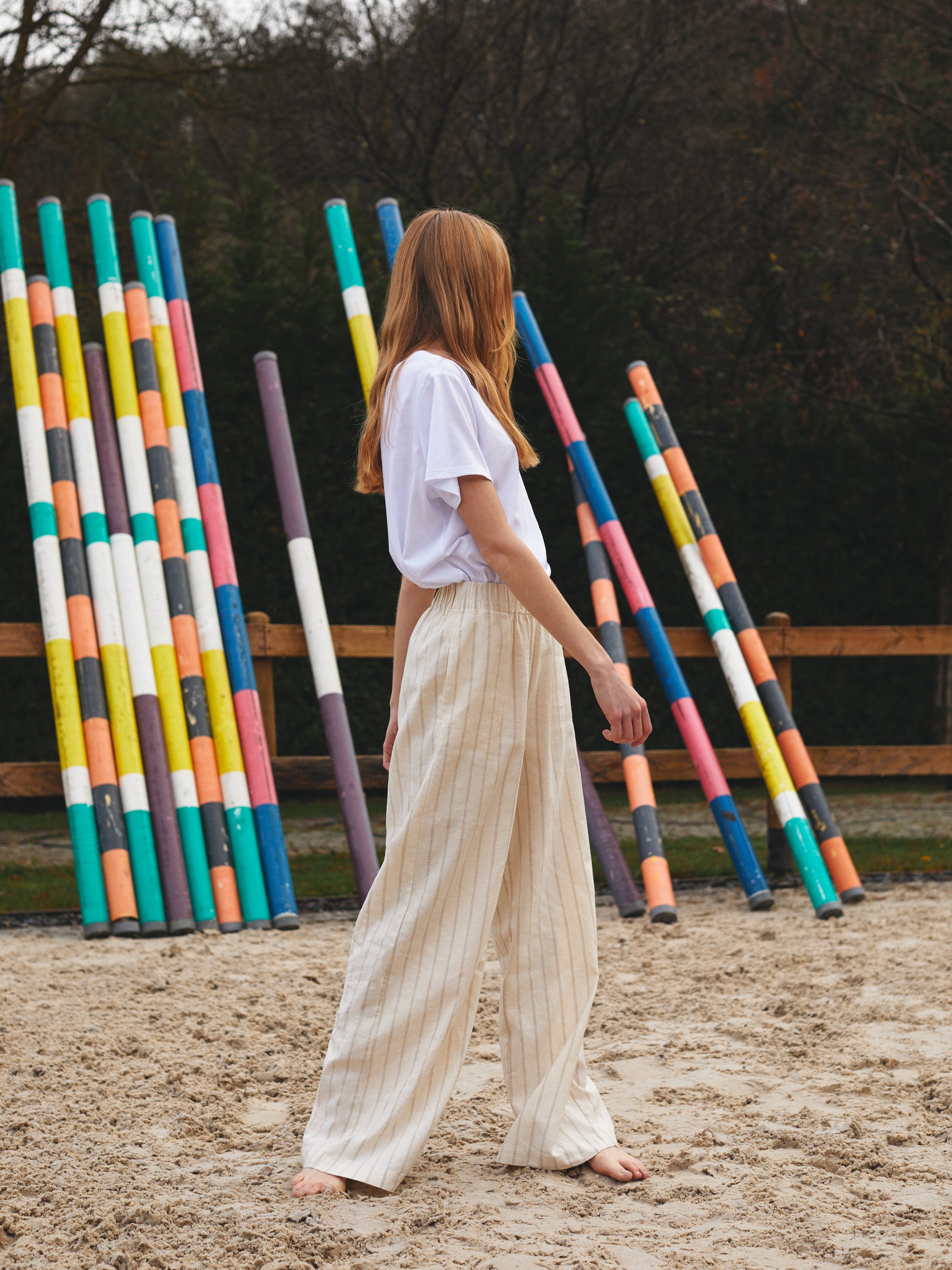 The striped wide-leg trousers combine effortless elegance with comfort through their lightweight drape and modern stripe pattern. Their breathable natural fabric provides all-day ease.