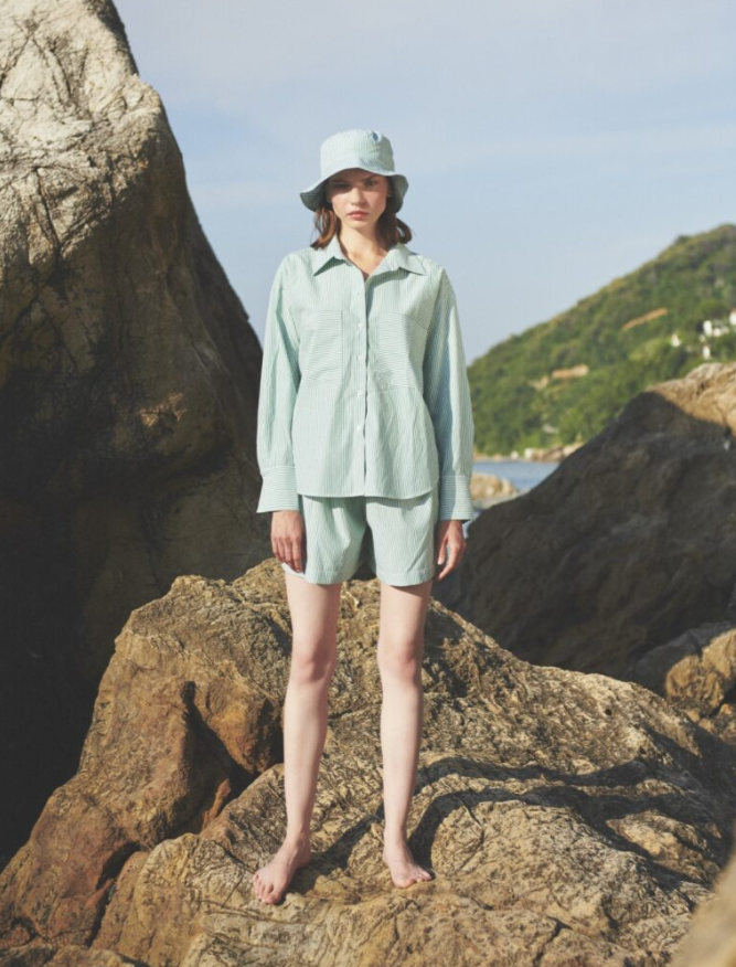 Yeşil ve beyaz çizgilerle tasarlanan gömlek–şort takımı, serin ve sakin bir ifade oluşturur. Yumuşak formu ve uyumlu yapısı sayesinde yaz günlerine hafif, temiz ve zahmetsiz bir stil katar; ayrıca resort sezonu için de ideal bir seçenektir.