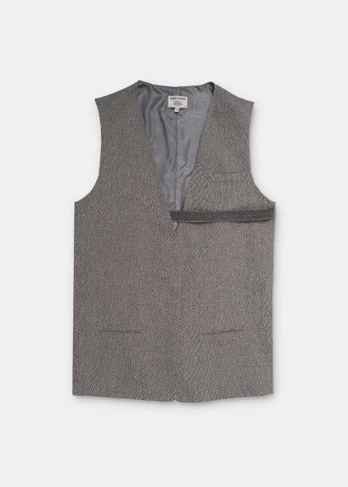 Düğmeli ve kuşaklı bir tasarıma sahip, mukarnas detaylarıyla süslenmiş keten karışımlı yelek.