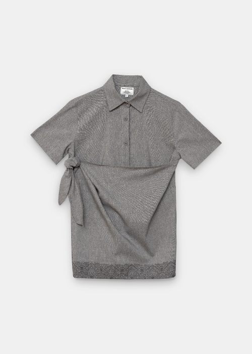 Mukarnas işlemeli, keten karışımlı peştamal kumaştan "Imagination" gri kadın gömleği, kısa kollu ve kuşaklı tasarımıyla pantolon takımıyla zamansız bir set oluşturur.